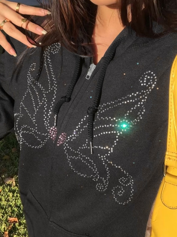 Vintage Butterfly Rhinestone Zip Up Oversized Hoodie