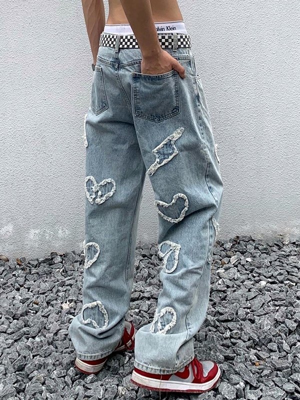Men’s Heart Patch Light Wash Loose Jeans
