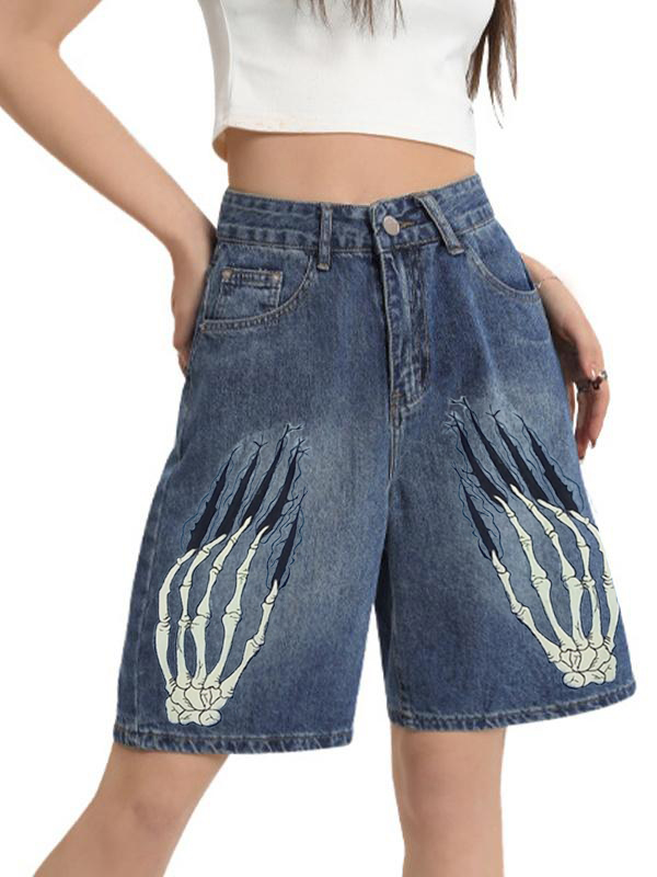 Vintage Washed Skull Print Casual Denim Shorts