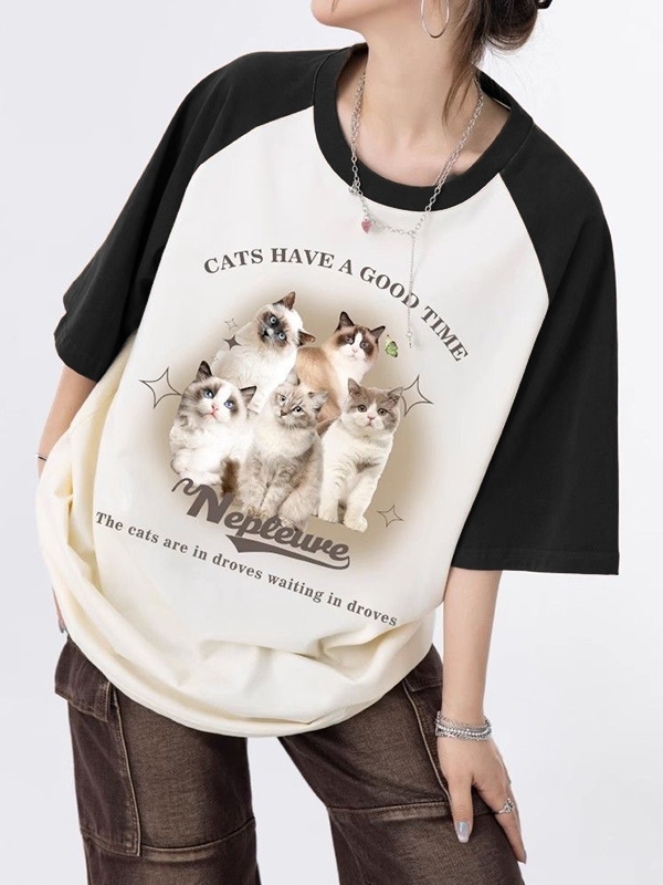 Vintage Cat Print Raglan Oversized Short Sleeve Tee