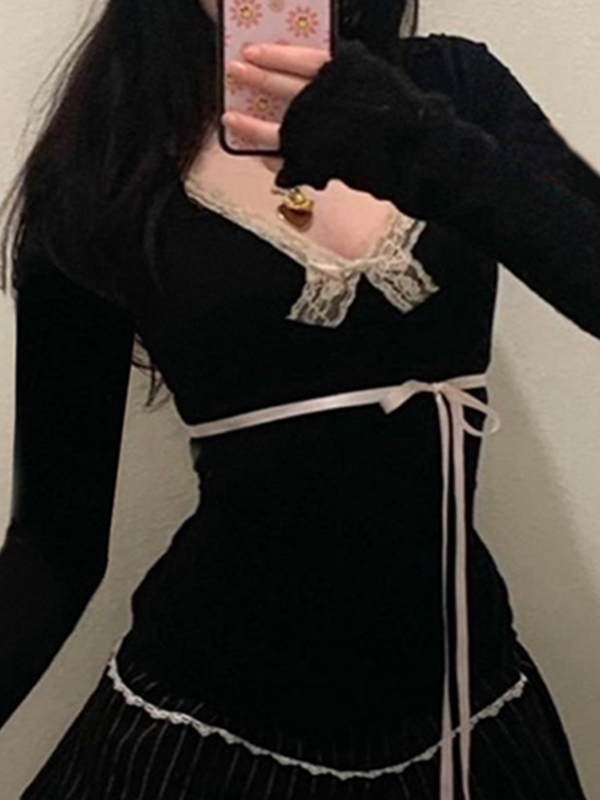 Lace Trim Bow Splice V Neck Long Sleeve Tee