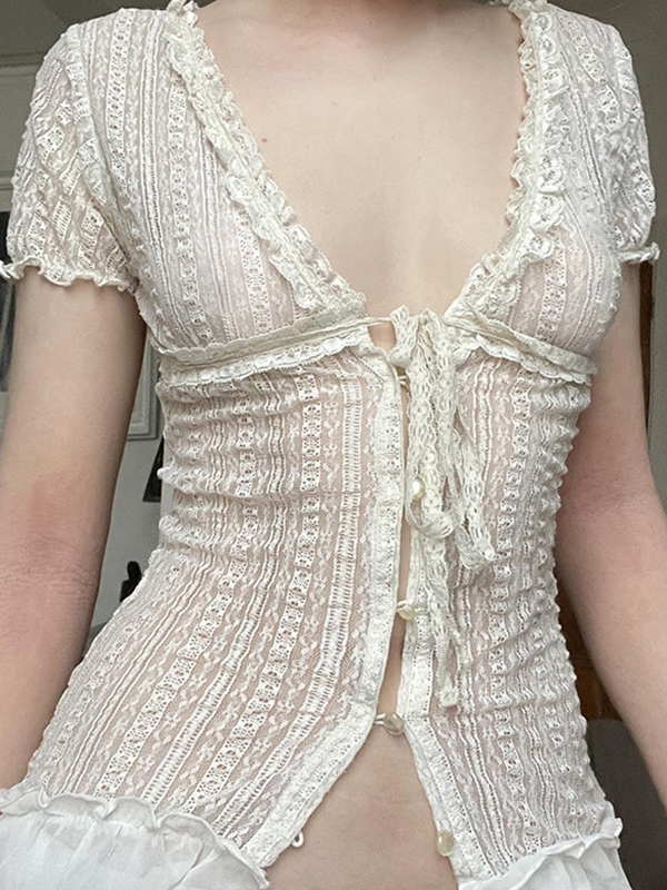 Lace Bubble Sleeve Short Sleeve Tee