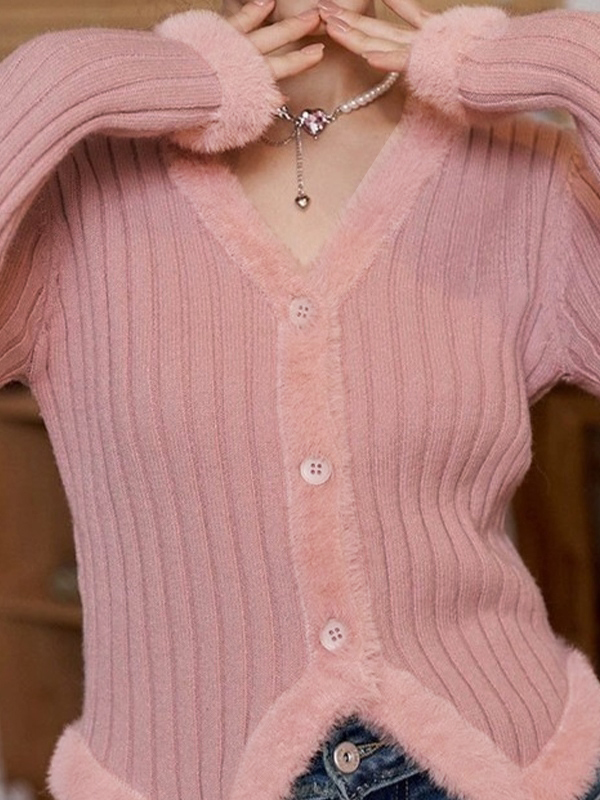 Solid V Neck Fuzzy Trim Slim Ribbed Knit Cardigan