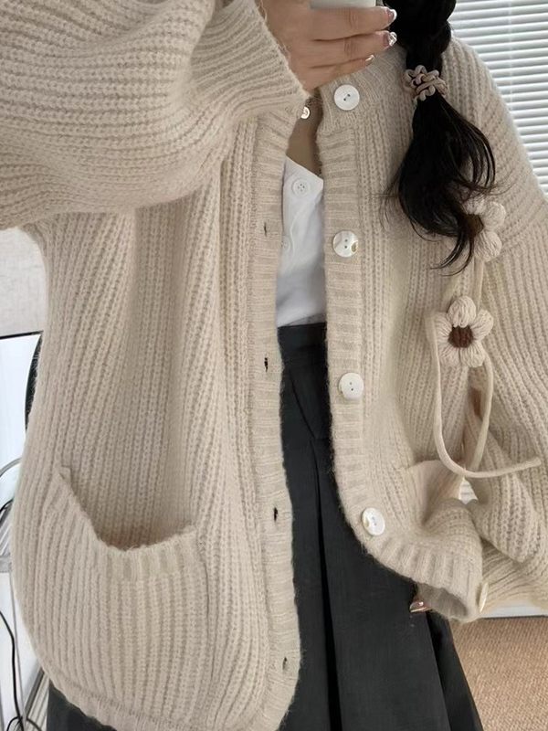 Three Dimensional Flower Decor Crew Neck Knit Cardigan