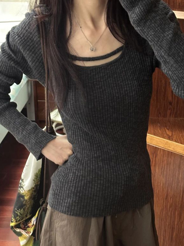 Basic Solid Square Neck Slim Long Sleeve Knit