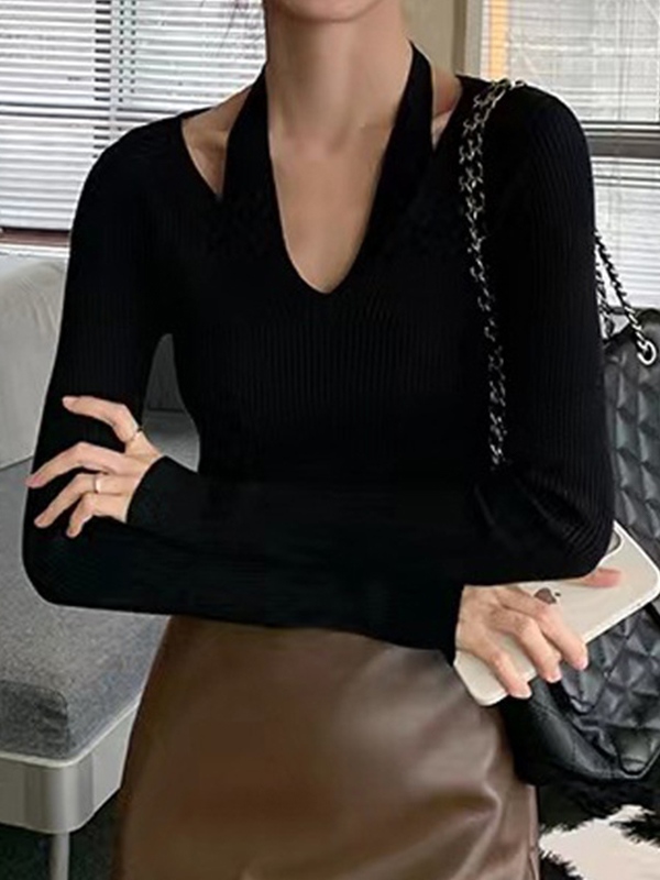 Solid Halter Backless Curvy Hem Long Sleeve Knit