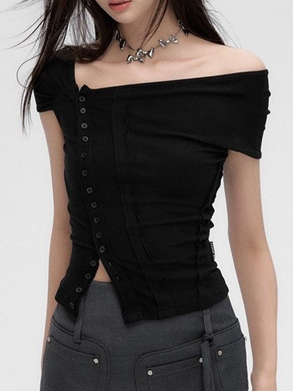 Button Off Shoulder Patchwork Short Sleeve Knits