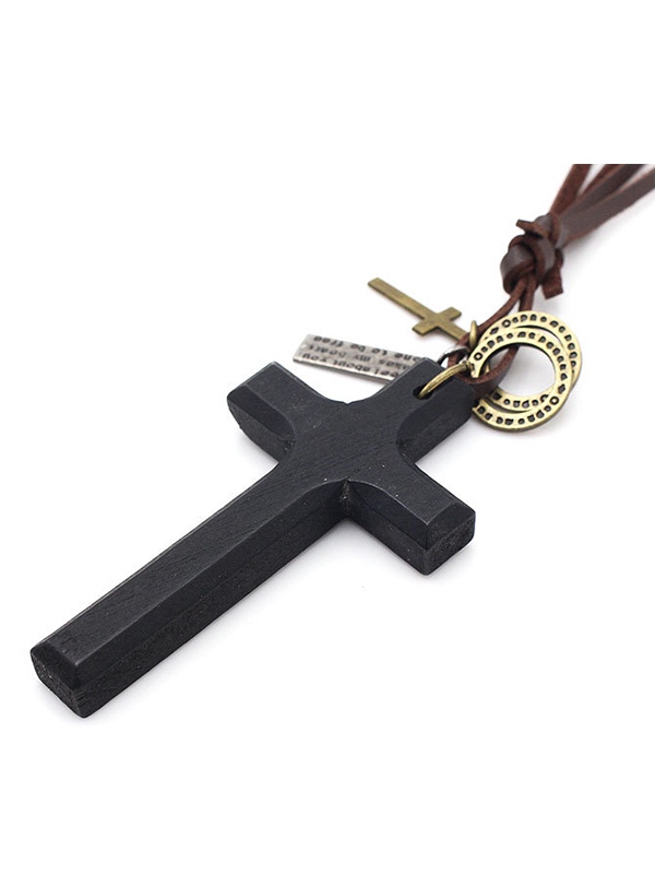 Wooden Cross Pendant Leather Necklace