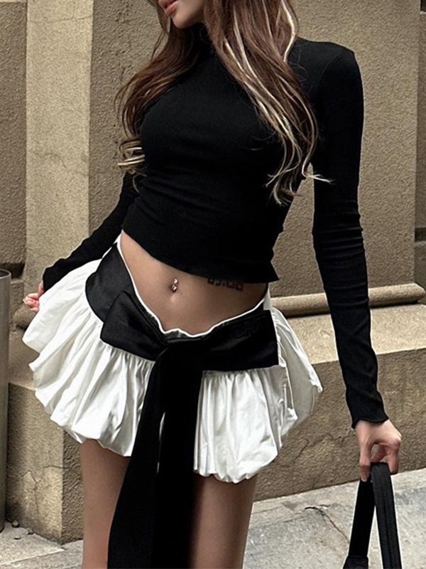 Solid Tie Back Long Sleeve Tee&Bow Decor Bud Skirt Set